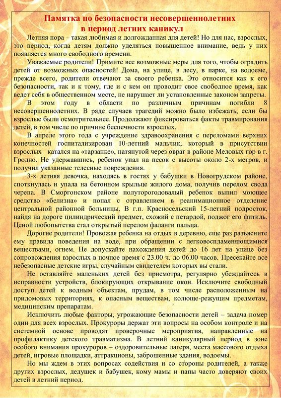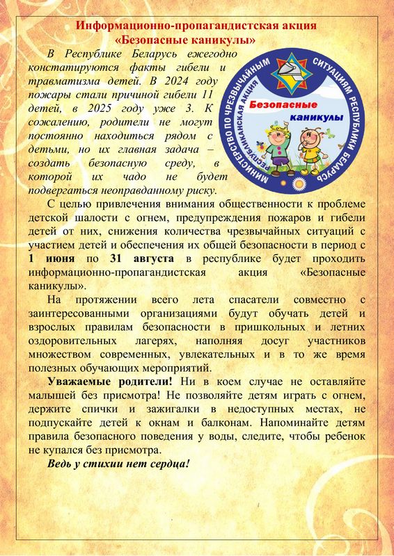 С целью привлечения внимания общественности к проблеме детской шалости с огнем, предупреждения пожаров и гибели детей от них, снижения количества чрезвычайных ситуаций с участием детей и обеспечения их общей безопасности в период с 1 июня по 31 августа в республике будет проходить информационно-пропагандистская акция «Безопасные каникулы».
