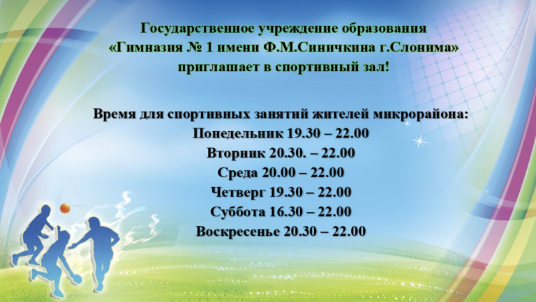 • Загруженность спортивного зала государственного учреждения образования «Гимназии № 1 имени Ф.М.Синичкина г.Слонима» на II полугодие 2025/2026 учебного года смотреть