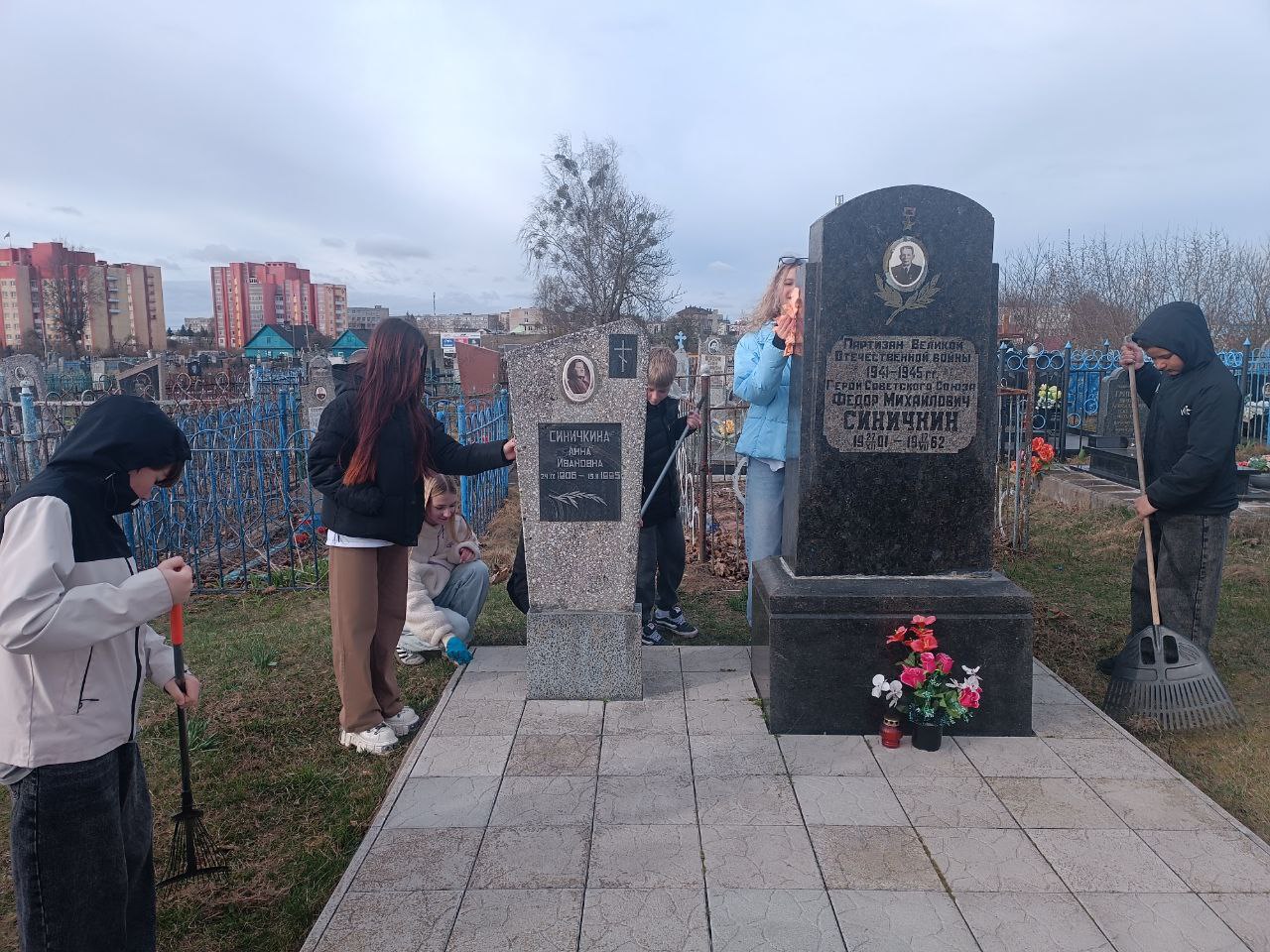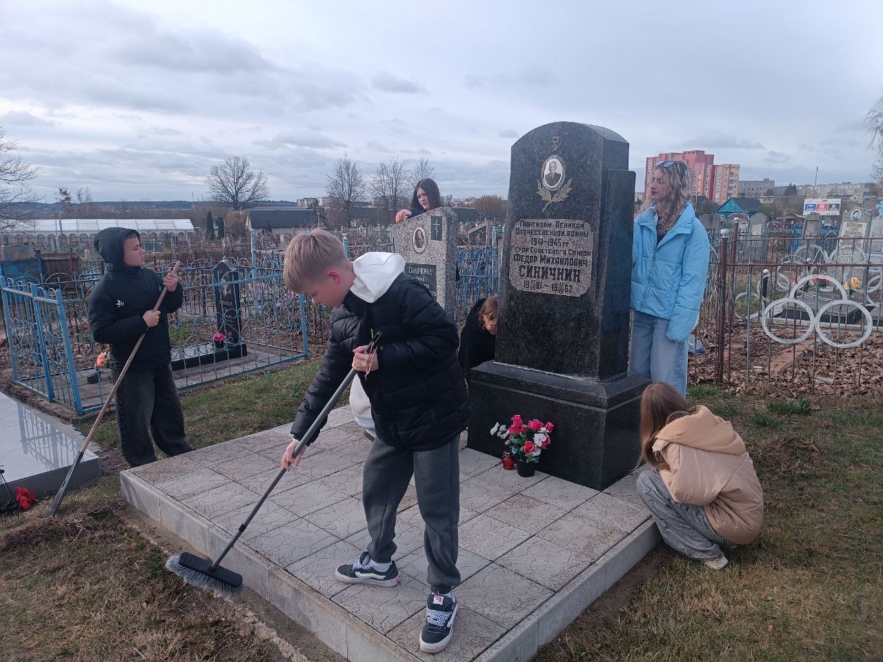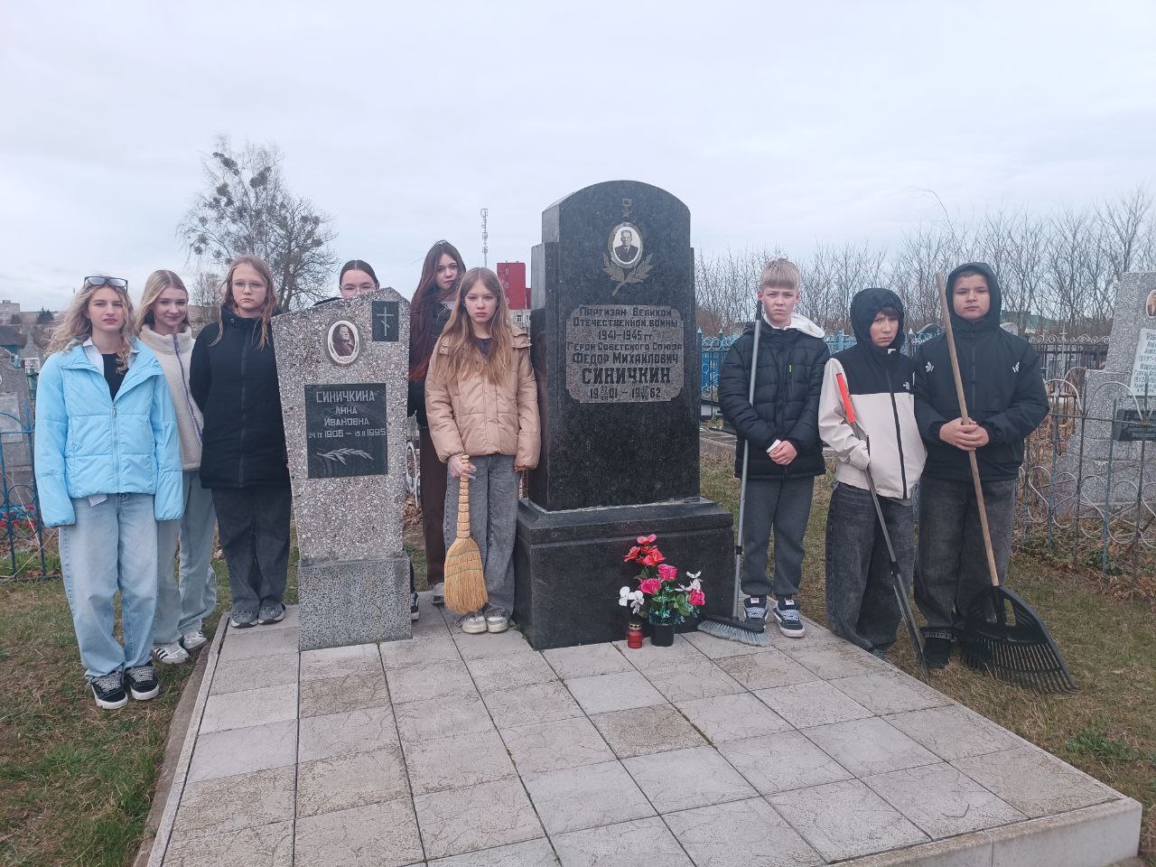 5 апреля в рамках районного субботника, шестого школьного дня, волонтёры, члены кружка «Позитив в действии «ГУО «Гимназия № 1 имени Ф.М.Синичкина г.Слонима» навели порядок на месте захоронения Ф.М.Синичкина - участника Великой Отечественной войны, Героя Советского Союза, имя которого носит наше учреждение образования, а также почтили минутой молчания память о славном воине.