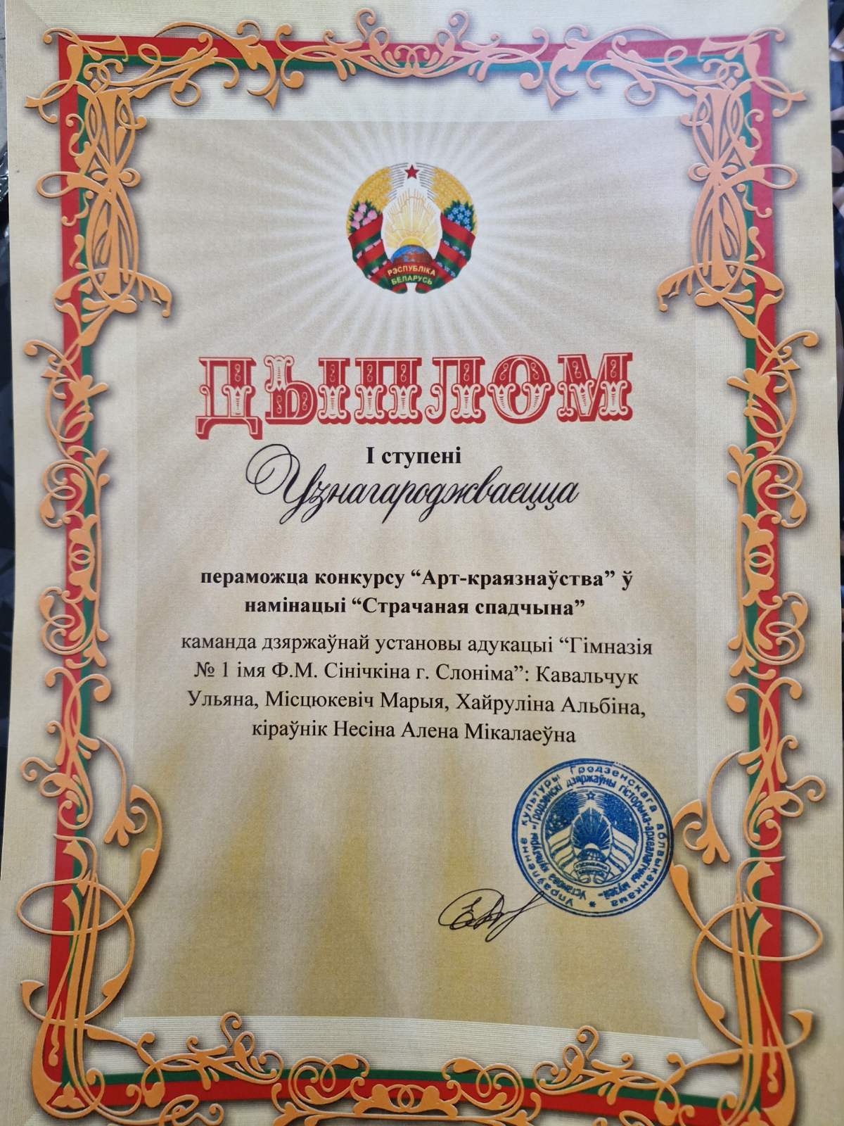 Команда ГУО «Гимназия № 1 имени Ф.М.Синичкина г.Слонима» стала победителем областного конкурса «Арт-краеведение». С заслуженной победой поздравляем учащихся: Ковальчук Ульяну, Хайрулину Альбину, Мистюкевич Марию, их руководителя Несину Елену Николаевну! Талант, настойчивость и целеустремленность достойны самой высокой похвалы. Пусть этот успех послужит дополнительным источником вдохновения и мотивации двигаться дальше, открывая новые вершины.
