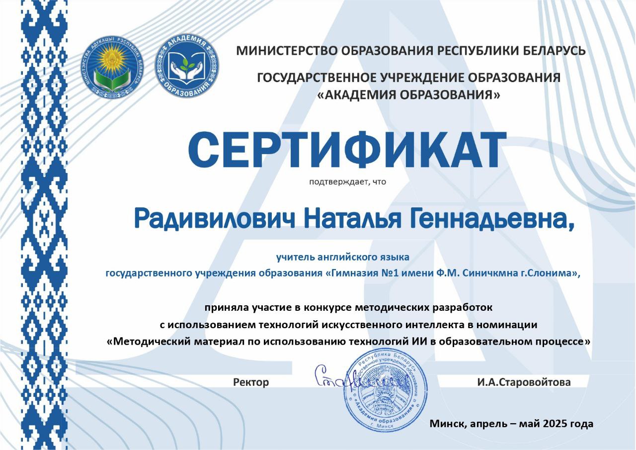Поздравляем Наталью Геннадьевну, принявшую активное участие в республиканском конкурсе ИИ!!! Молодец! Так держать!