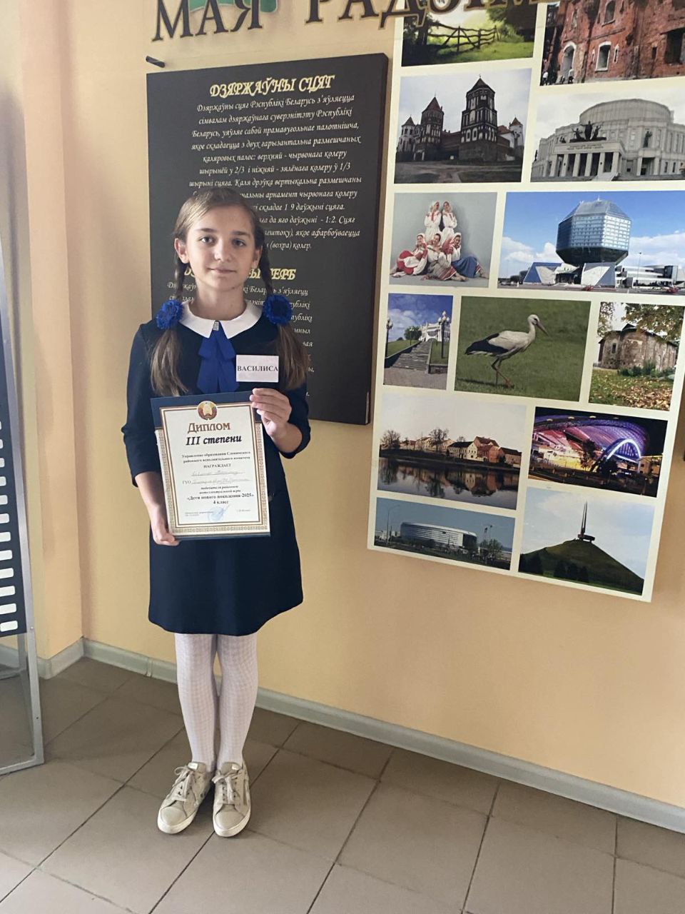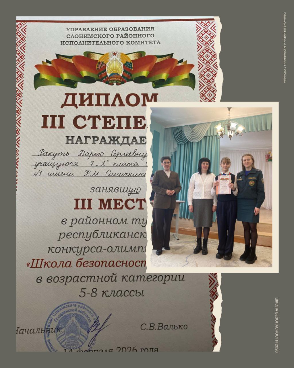 От души поздравляем учащуюся 7 класса Ракуть Дарью и её руководителя Михалик М.И. с дипломом III степени в районном этапе республиканского конкурса «Школа безопасности»!