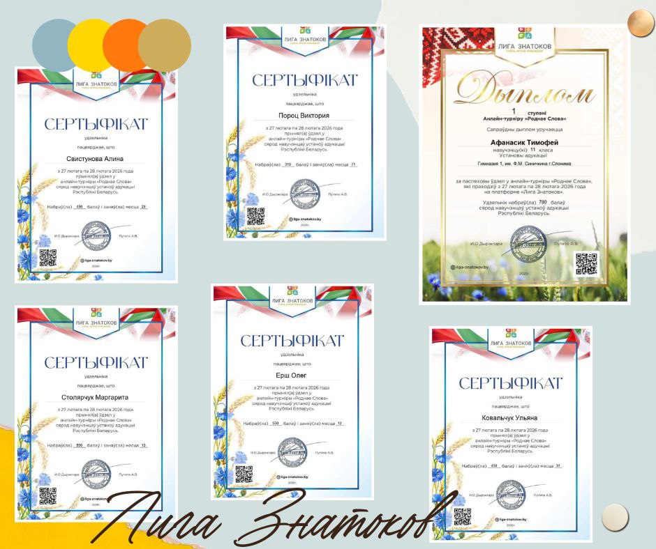 Гімназісты прынялі актыўны удзел у Лігі Знатакоў і змогуць абмяняць набраныя балы на прызы! Па выніках анлайн-турніру «Роднае слова» ў скарбонцы гімназіі дыплом 1 ступені у вучня 11 класа Афанасіка Цімафея і 5 сертыфікатаў. Малайцы! Жадаем вам поспехаў у будучых спаборніцтвах!