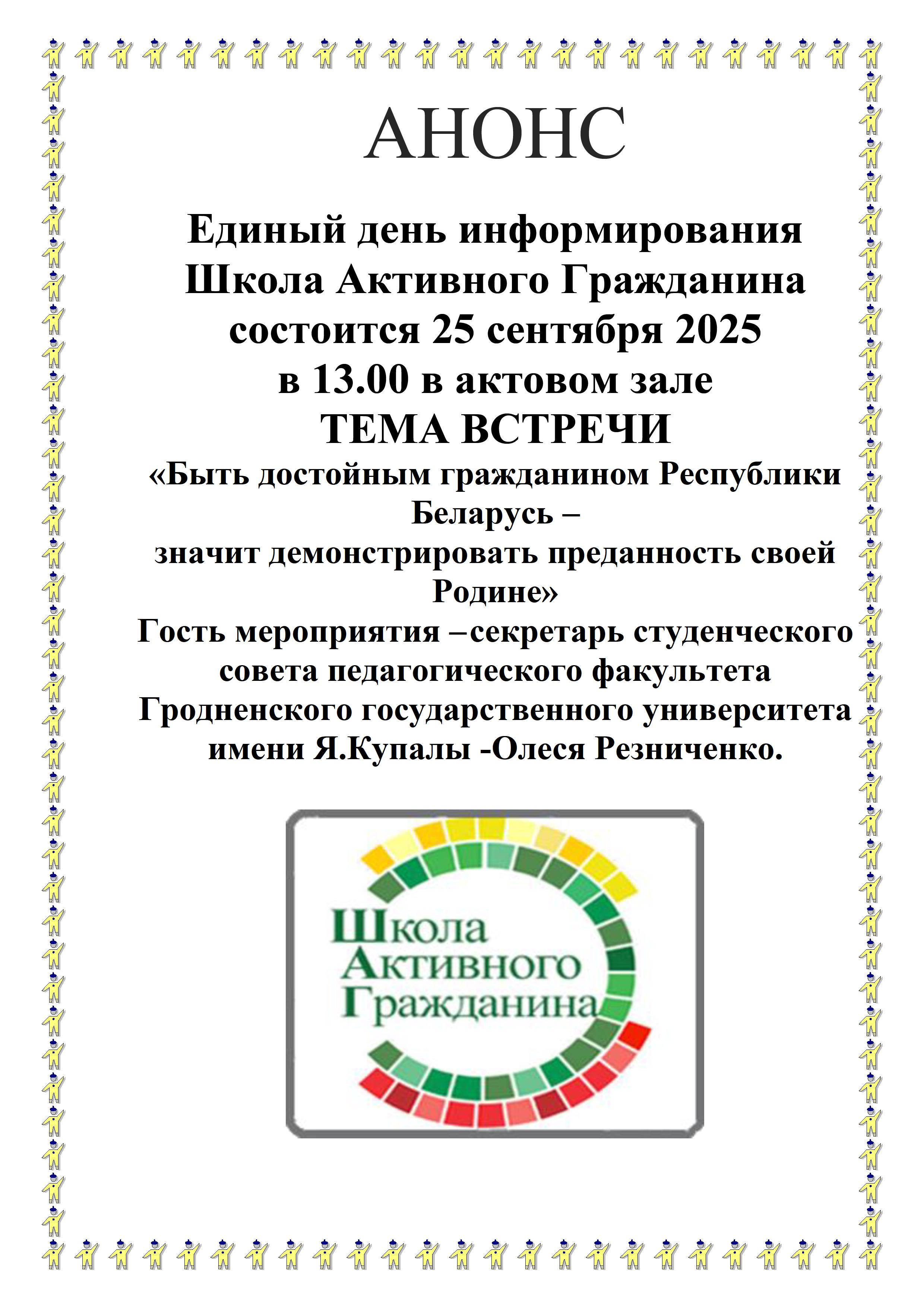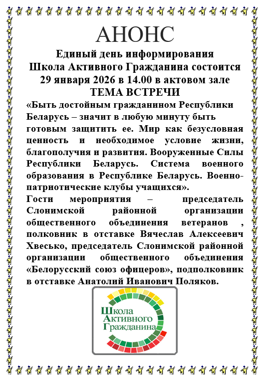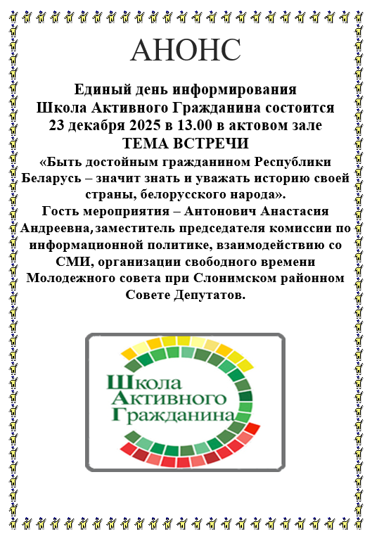23 декабря 2025 года в учреждениях образования состоялось очередное занятие в рамках информационно-образовательного проекта «Школа Активного Гражданина» (ШАГ) на тему «Быть достойным гражданином Республики Беларусь – значит знать и уважать историю своей страны, белорусского народа!».