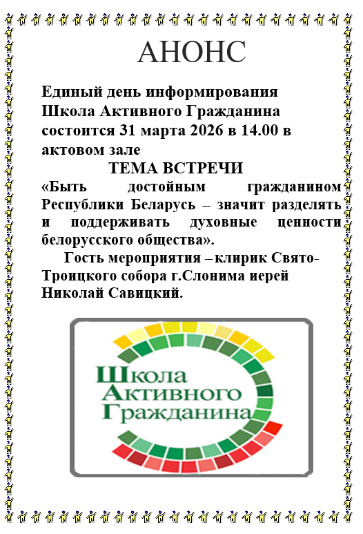 31 марта 2026 года в учреждениях общего среднего образования в рамках информационно-образовательного проекта «Школа Активного Гражданина» состоялось занятие по теме «Быть достойным гражданином Республики Беларусь – значит разделять и поддерживать духовные ценности белорусского общества».
