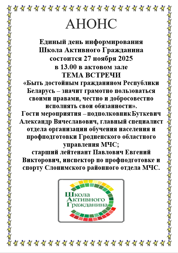 27 ноября 2025 года в учреждениях образования состоялось очередное занятие в рамках информационно-образовательного проекта «Школа Активного Гражданина» (ШАГ) на тему «Быть достойным гражданином Республики Беларусь – значит грамотно пользоваться своими правами, честно и добросовестно исполнять свои обязанности».