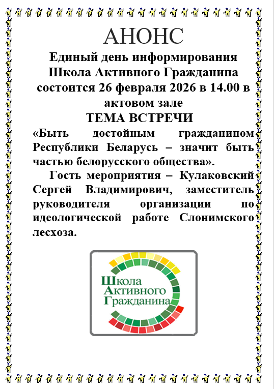 26 февраля 2026 года в учреждениях общего среднего образования в рамках информационно-образовательного проекта «Школа Активного Гражданина» состоялось занятие по теме «Быть достойным гражданином Республики Беларусь – значит быть частью белорусского общества».