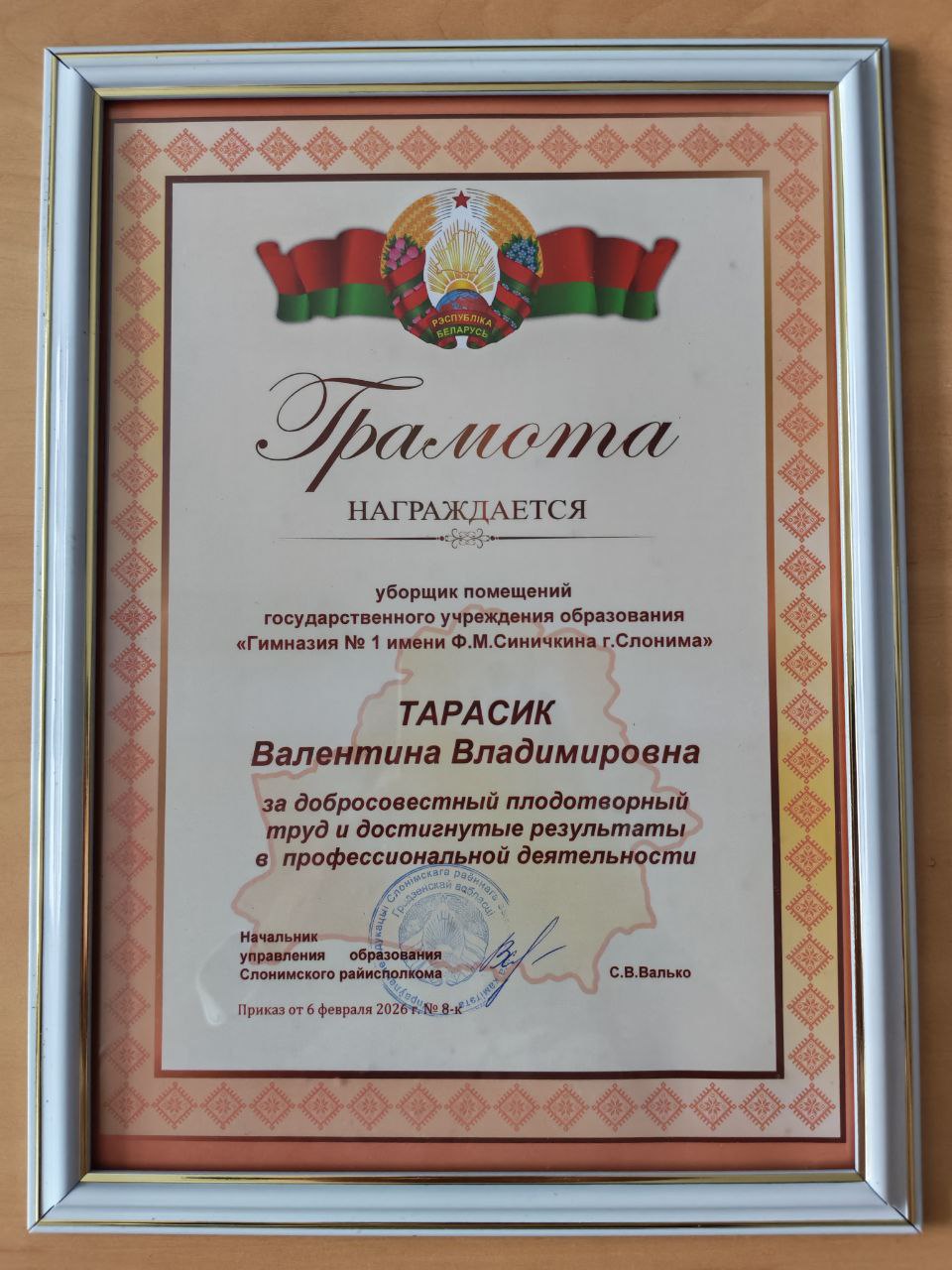 12 февраля в торжественной обстановке на итоговой коллегии управления образования Слонимского районного исполнительного комитета грамотой Слонимского районного исполнительного комитета за добросовестный плодотворный труд и достигнутые результаты в профессиональной деятельности награждена уборщик помещений ГУО «Гимназия № 1 имени Ф.М.Синичкина г.Слонима» Тарасик Валентина Владимировна. «Спасибо за нелёгкий труд!»