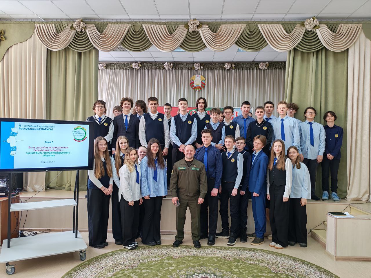26 февраля учащиеся ГУО «Гимназия № 1 имени Ф.М.Синичкина г.Слонима» приняли участие в информационно-образовательном проекте «ШАГ» - «Школа Активного Гражданина». Тема встречи - «Быть достойным гражданином Республики Беларусь - значит быть частью белорусского общества». На мероприятии присутствовал Кулаковский Сергей Владимирович, заместитель руководителя организации по идеологической работе Слонимского лесхоза. Сергей Владимирович напомнил гимназистам о том, кто такой патриот, что такое патриотизм, что такое созидательный труд. Рассказал о возможностях и перспективах белорусской молодёжи (участие в различных конкурсах и проектах), о программе развития регионов «Один район - один проект».